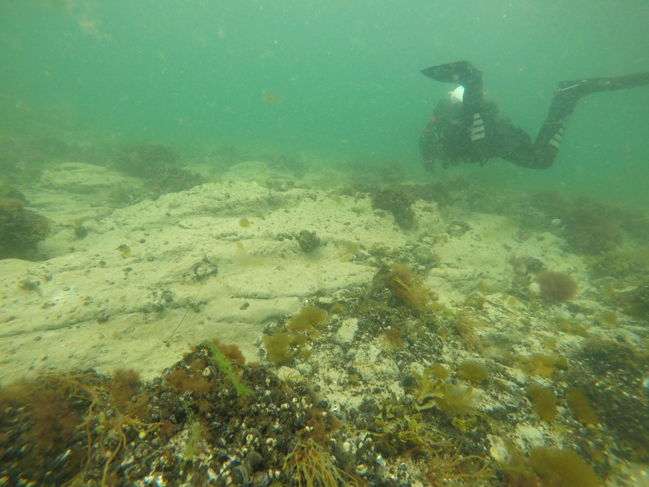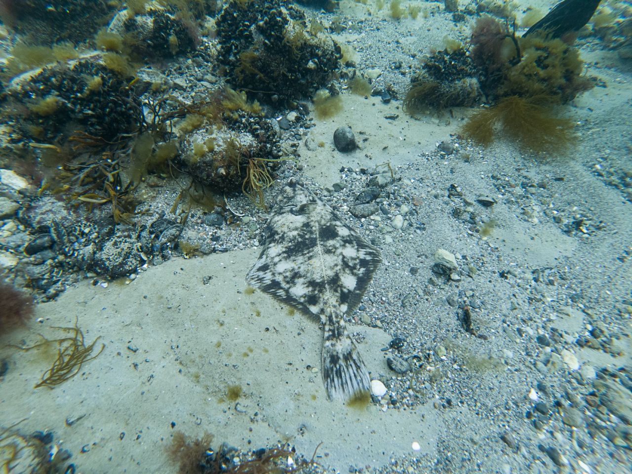 In der Nacht wurden manche von uns unliebsam von herabfallenden Regentropfen geweckt, welche sich hierher verirrt haben. Aber gegen 7.00 Uhr war davon nichts mehr zu spüren. Der Himmel hing zwar noch voll Wolken, aber dennoch trübte das unsere gute Laune nicht. Der Wind fegte mit einer leichten Brise aus Süd-West über das Land. Wir entschieden uns noch einmal den Einstieg in Börgerende zu wagen, da es dort etwas geschützter ist und die Hoffnung auf gute Sichtverhältnisse bestand. Wir fuhren heute etwas später los, so waren wir erst kurz nach 11.00 Uhr am Tauchgewässer. Die Ausrüstung wurde zusammengebaut und man nahm noch die ein oder andere Optimierung vor. Mit unserer Tauchausrüstung ging es dann endlich vom Parkplatz über die Straße und ein paar Stufen direkt zum Strand. Nach einem Buddycheck erfolgte recht zeitnah das Abtauchen, da heute die Wellen etwas mehr gegen die Buhnen schlugen. Wir ließen den Sand und die grüne Seegraswiese hinter uns. Bis wir dann endlich zu Steinfeldern und den Mergelbänken gelangten. Angekommen an diesem schönen Ort ließ sich sogar gelegentlich die Sonne blicken und zeigte uns eine doch recht farbenfrohe Unterwasserwelt, für heimische Verhältnisse. Die üblichen Meeresbewohner versteckten sich heute teilweise wieder gekonnt, aber unser, doch so langsam gut geschultes Auge, konnte diesen auch recht großen Steinbutt, welcher sich gut getarnt hatte, entdecken. Wir genossen wieder diesen einmaligen Tauchgang bei guten Wetterverhältnissen.